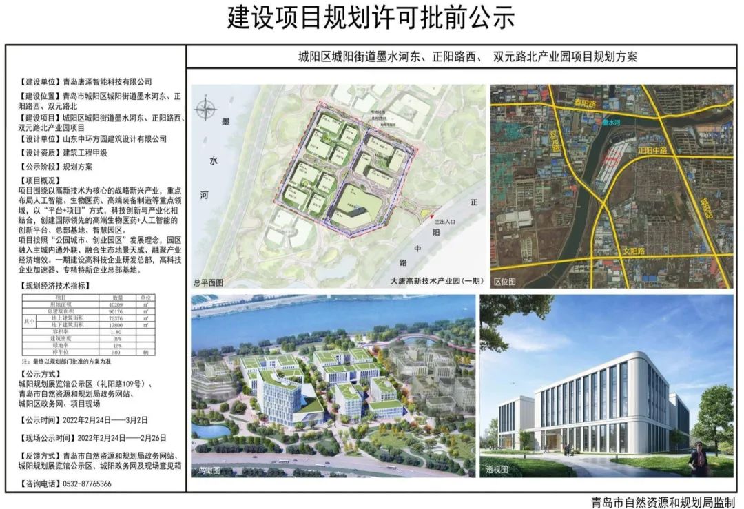 日前,青岛市自然资源和规划局发布《城阳区城阳街道墨水河东、正阳路西、双元路北产业园项目规划方案批前公示》,项目由青岛唐泽智能科技有限公司建设。