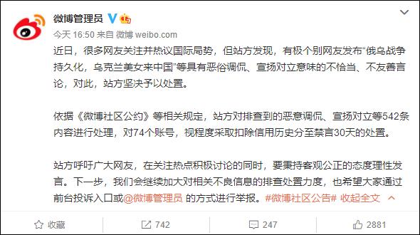 依据《微博社区公约》等相关规定,站方对排查到的恶意调侃、宣扬对立等542条内容进行处理,对74个账号,视程度采取扣除信用历史分至禁言30天的处置。