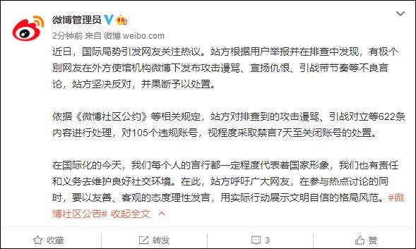 依据《微博社区公约》等相关规定,站方对排查到的攻击谩骂、引战对立等622条内容进行处理,对105个违规账号,视程度采取禁言7天至关闭账号的处置。