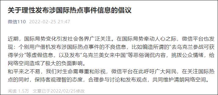 近期,国际局势变化引发社会各界广泛关注。在国际局势牵动人心之际,微信平台也发现:个别用户借机发布涉国际热点事件的不良信息,比如编造所谓的“去乌克兰参战可获得学分”等虚假信息,以及发布“乌克兰美女来中国”等恶俗调侃内容,挑拨公众情绪,给网络空间造成了极大的负面影响。