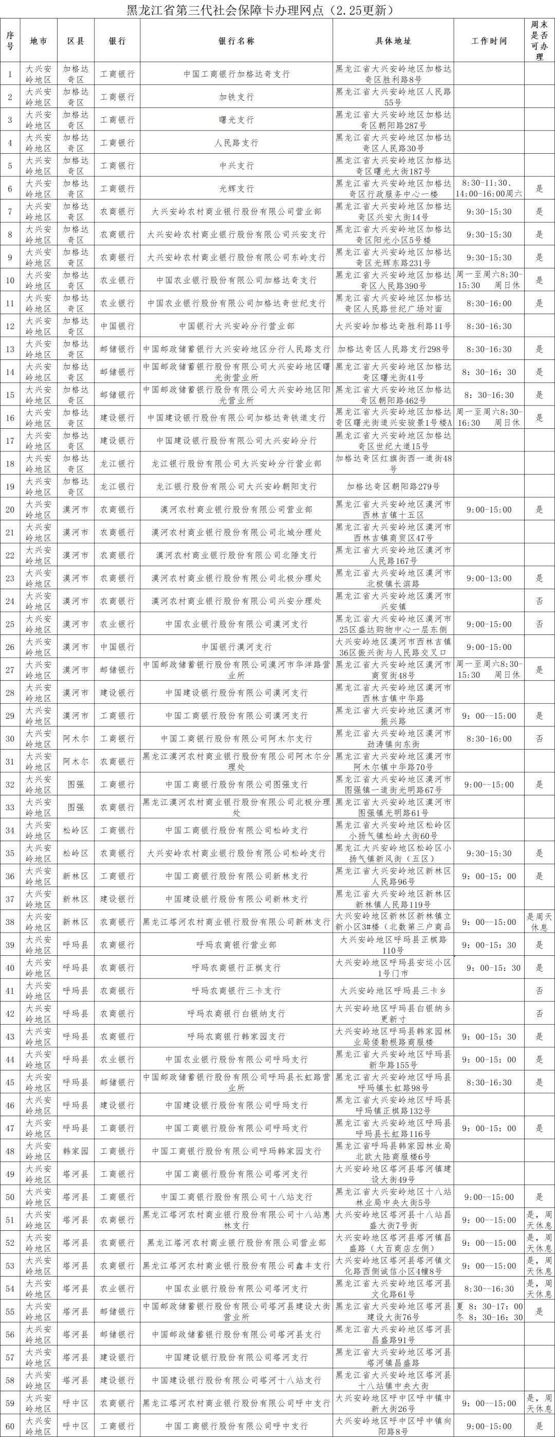 大兴安岭地区社保卡银行服务网点(2022年2月25日更新)