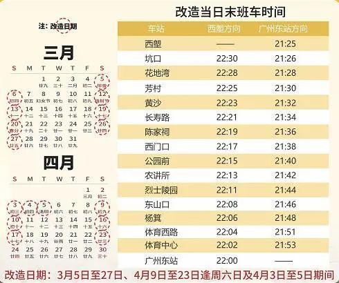 从明天(2月26)日起,广州地铁将通过站内广播、告示、地铁电视、官方App等渠道全方位提前进行预告。具体调整运营的日期为3月5日至3月27日的周六周日,4月9日至4月23日的周六周日,以及4月3日至5日的三天清明节假期,一号线西塱站、广州东站的末班车将分别于21:25、22:00发出。