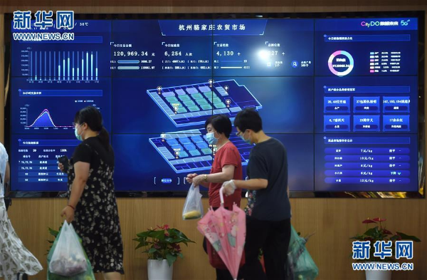 浙江省杭州市的5G农贸市场——骆家庄农贸市场的大屏幕上实时显示交易、客流等相关情况。新华社记者 韩传号/摄