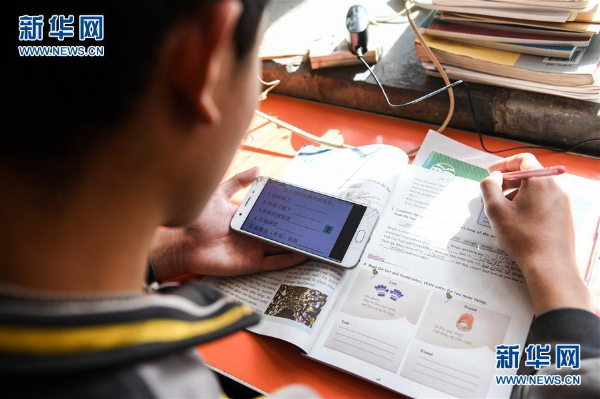内蒙古准格尔旗龙口镇红树梁村的初一学生刘进才在家中上网课。新华社记者 刘磊/摄