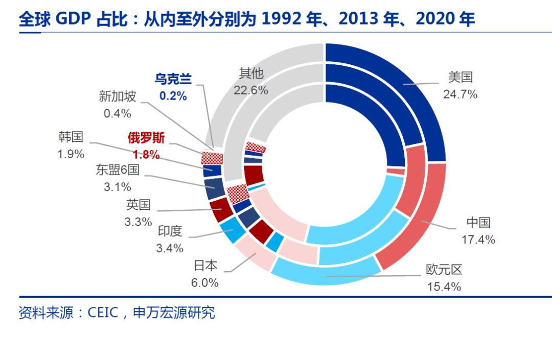 与之对比,俄罗斯虽然在能源上具有强大的支配力,但其经济体量仅与广东省相当,且卢布不是国际货币,在国际贸易中的整体分量也不算高。