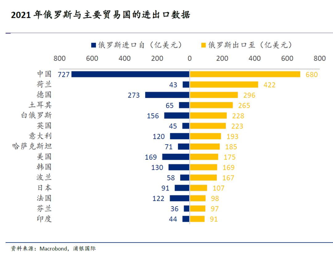 2021年,俄罗斯货物进出口额为7850亿美元。向欧洲出口大量石油、天然气,也从中国、德国、美国、韩国等地进口了大量的工业品。