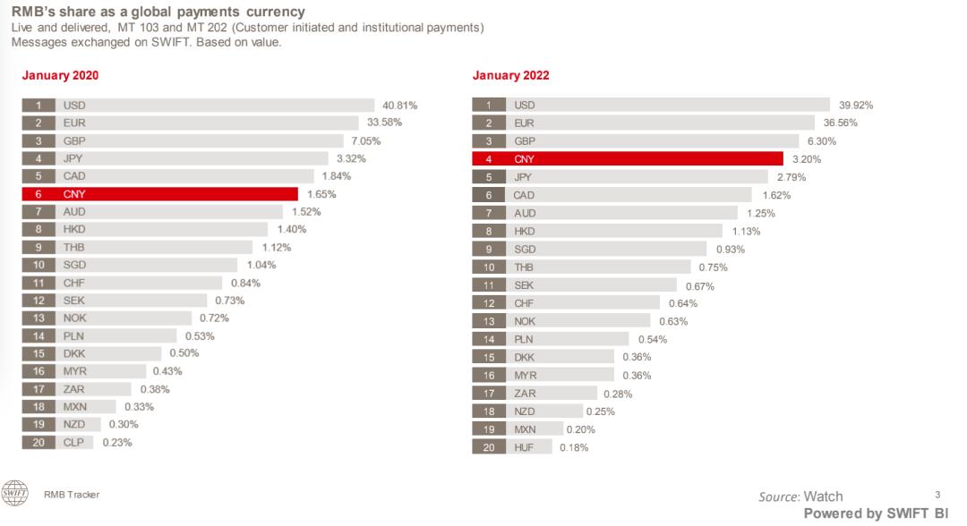 最新数据显示,2021年底,在主要货币的支付金额排名中,美元、欧元、英镑分别以40.51%、36.65%、5.89%的占比位居前三位,中国以2.7%的占比超过日本的2.58%,跻身第四位。