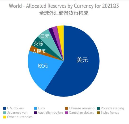 根据IMF发布的数据,截至2021年三季度,美元在全球储备货币中的份额虽然下降到1995年以来的新低,但仍旧高达59.15%。