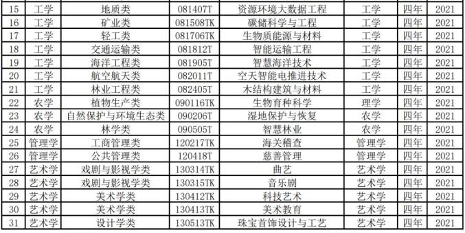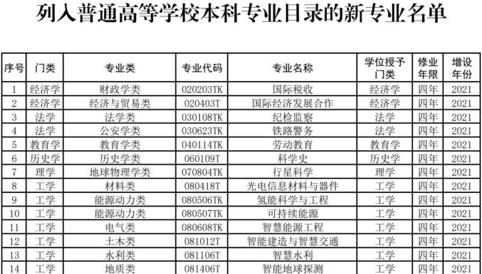 近日,教育部公布了2021年度普通高等学校本科专业备案和审批结果,新增1961个专业点、撤销804个专业点,碳储科学与工程、空天智能电推进技术、生物育种科学、资源环境大数据工程、湿地保护与恢复、智慧林业、劳动教育、科学史等31种新专业列入《普通高等学校本科专业目录》。