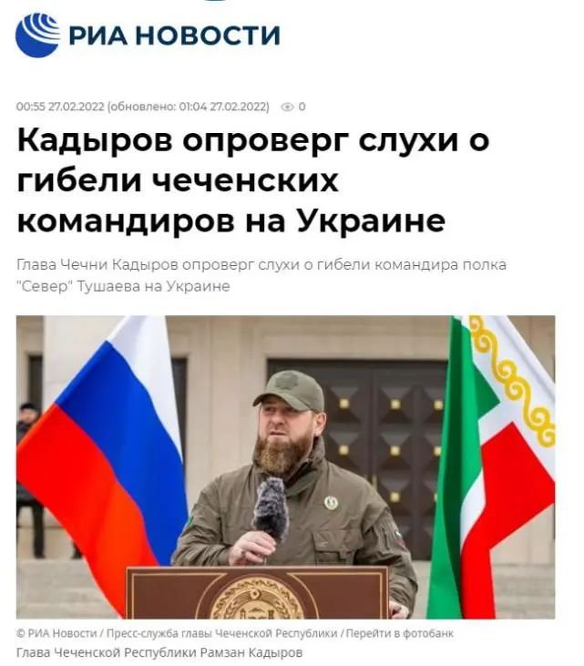 据俄新社27日报道,俄罗斯车臣共和国领导人卡德罗夫在社交媒体上发文驳斥了有关车臣一支部队在乌克兰被歼灭的消息。此前,网络上出现了有关车臣“北方”团指挥官穆罕默德·图沙耶夫和“阿赫马特-格罗兹内”特警队指挥官安佐尔·比萨耶夫死亡的消息。乌克兰总参谋部证实,乌克兰部队在基辅附近的戈斯托梅利地区歼灭了一支车臣特种兵部队。乌克兰总统办公室也对此消息予以了证实。