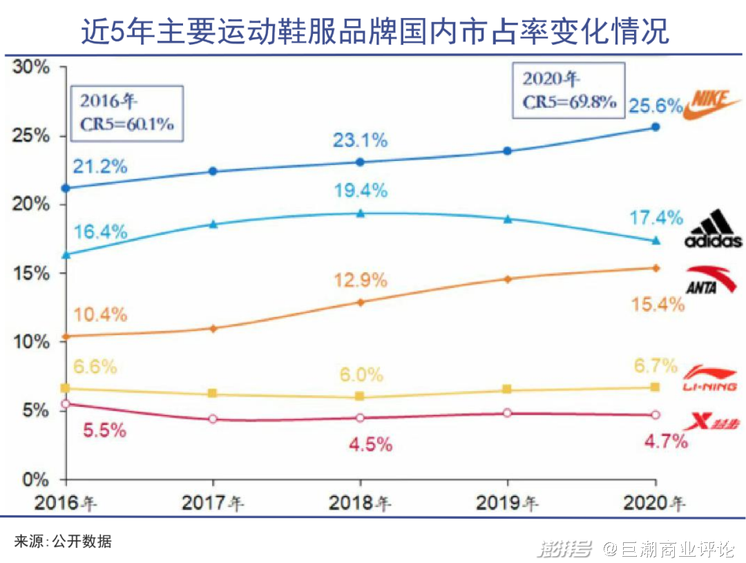 但与此同时我们看到,运动服饰品牌却几乎没有受到疫情的任何影响,同时也罕有竞争对手冒头——行业仍然是两超、多强的局面,疫情对于强势企业几乎形不成冲击,而且不仅是国际,国内的行业格局也同样稳固。