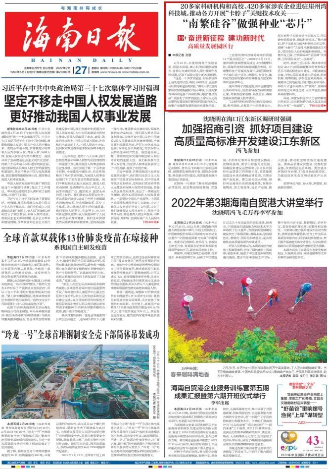 2月27日刊发的《海南日报》头版聚焦《“南繁硅谷”做强种业“芯片”》。报道称,目前已有20多家科研机构和高校、420多家涉农企业进驻崖州湾科技城,国家南繁作物表型研究设施、国际玉米技术创新与成果转化中心等一批科技创新平台建设有序推进,将统筹各方科研力量联合攻关。全文如下↓