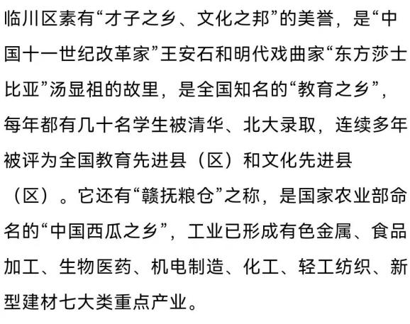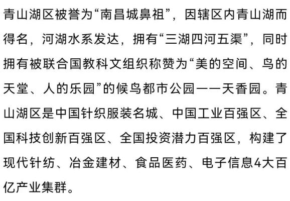南昌县是江西省首府首县,是一个有着悠久历史和文化内涵的千年古县。它文化底蕴厚重,自公元前202年汉大将灌婴筑城建县至今有2200多年的历史,是南昌采茶戏的发祥地,境内有古建筑、古遗址30多处。它是江西省第一个百强县,2021年实现地区生产总值1195.57亿元,是全省第一个也是唯一一个GDP总量破千亿的县级区域,围绕“3+3+N”产业体系,聚焦汽车及新能源汽车、生物医药、绿色食品、智能装备制造等产业。