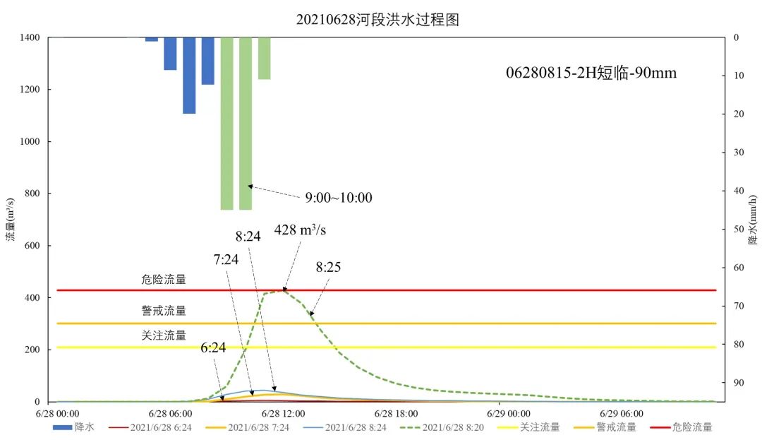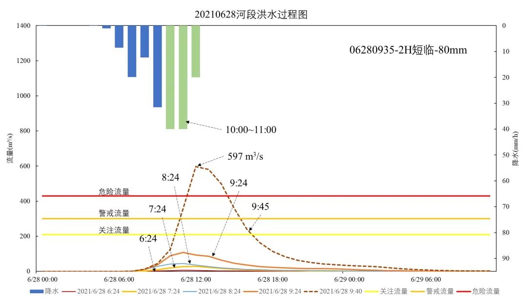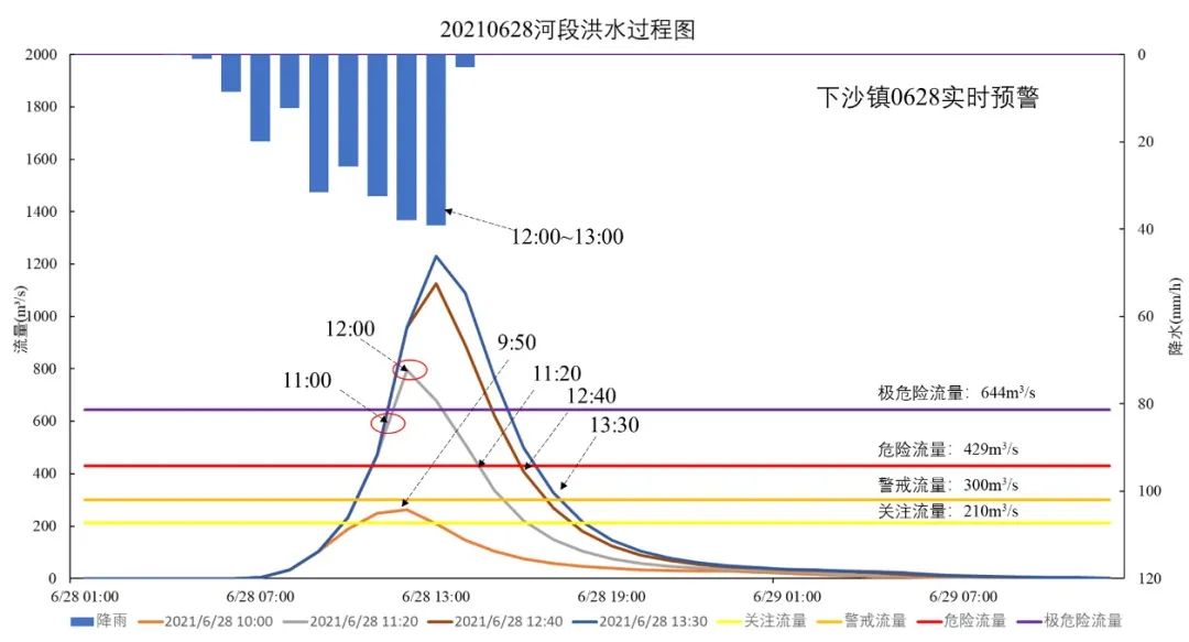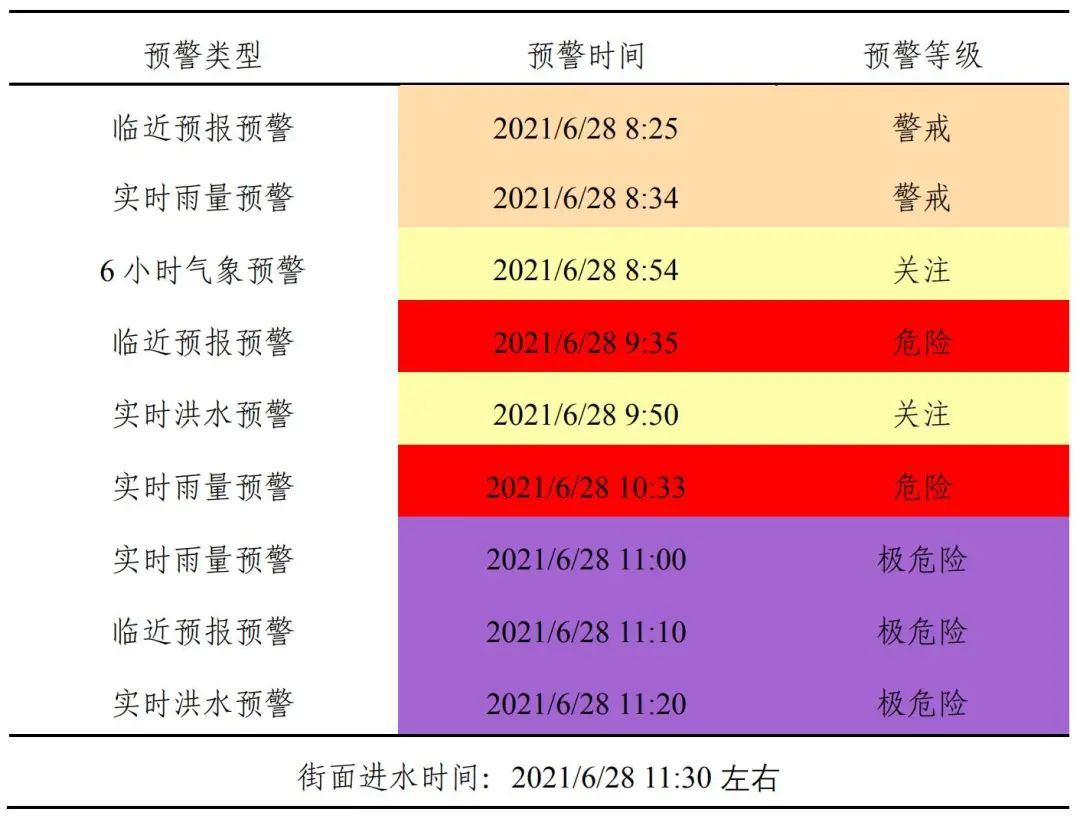 实时预警分析:2021年6月28日8时34分,邵武市下沙镇过去3小时累计降雨76毫米,实时雨量预警达到警戒级别;当日9时50分,实时洪水预警达到关注级别;当日10时33分,下沙镇过去3小时累计降雨量已达110毫米,实时雨量预警等级提升至危险,预见期约1小时;当日11时20分,实时洪水预警等级提升至极危险,预见期约10分钟。