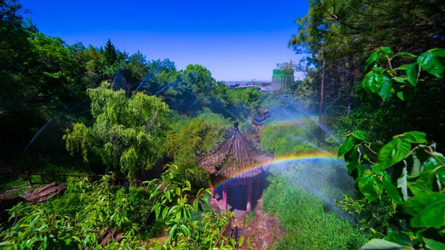 彩虹雨体验区--雪山彩虹谷的“C位”景点,全长360米,利用人工喷射雨雾,在空中经过阳光的折射形成美丽的彩虹,在这里,不用经历风雨就能见彩虹~