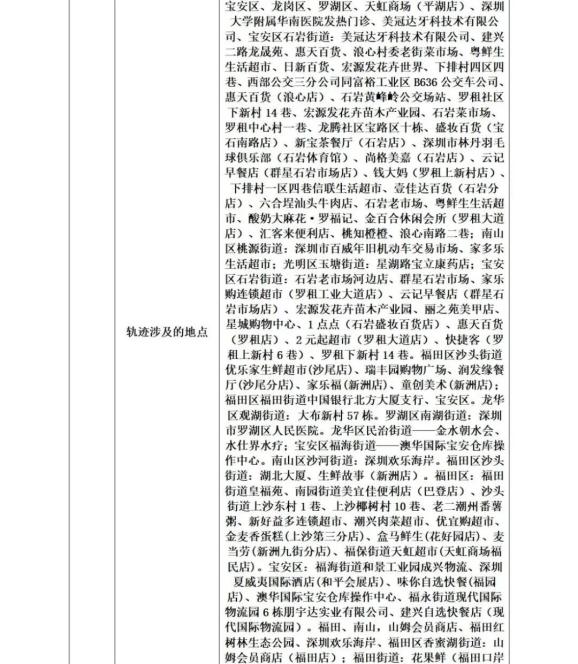 龙岗区、福田区(莲花街道万科城市花园、福田街道皇庭世纪、福保街道益田村、福田街道锦洲花园、沙头街道上沙东村6巷、7巷、4巷、8巷、莲花街道万科城市花园、莲花街道金色假日名苑、莲花街道华茂欣园)、南山区(蛇口街道雷公岭村、招商街道爱榕园、沙河街道汇雅苑、蛇口街道雷公岭15号、南山街道龙海家园、蛇口街道招商路66号)、龙华区民治街道樟坑1区