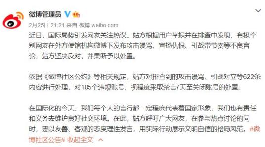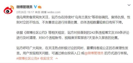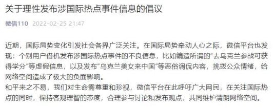 近期,国际局势变化引发社会各界广泛关注。在国际局势牵动人心之际,微信平台也发现:个别用户借机发布涉国际热点事件的不良信息,比如编造所谓的“去乌克兰参战可获得学分”等虚假信息,以及发布“乌克兰美女来中国”等恶俗调侃内容,挑拨公众情绪,给网络空间造成了极大的负面影响。
