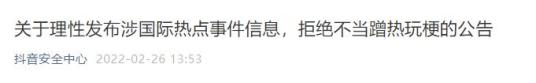 近日,国际热点地区的冲突引发各方关注。包括很多媒体在内的众多创作者在抖音平台发布内容,真实、客观、及时的报道与分析当地情况。同时,抖音平台在日常巡检中发现,极个别用户借助热点事件,不当蹭热、玩梗。特别是以痛点为笑点,发布诸如“俘虏乌克兰美女”等视频,传播不当价值观,破坏平台氛围。