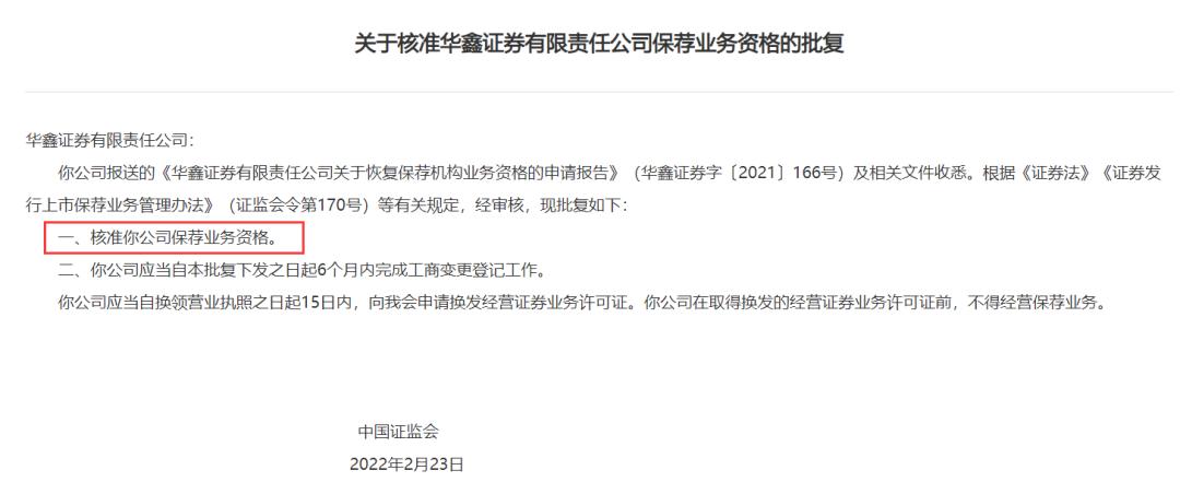 2月25日,证监会核准华鑫证券保荐业务资格。
