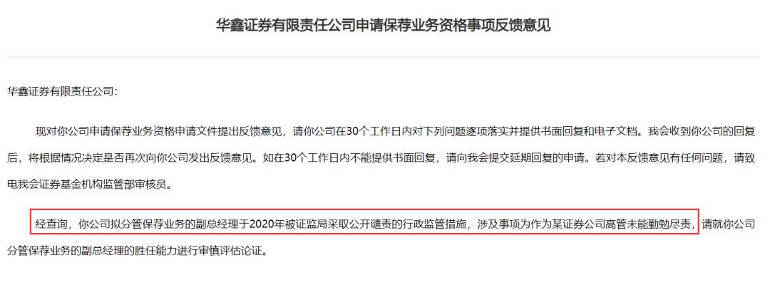 有意思的是,在华鑫证券获得投行保荐业务牌照之前,证监会曾经在1月21日向华鑫证券提出反馈称,拟分管保荐业务的副总经理于2020年被证监局采取公开谴责的行政监管措施,涉及事项为作为某证券公司高管未能勤勉尽责,请对其胜任能力进行审慎评估论证。