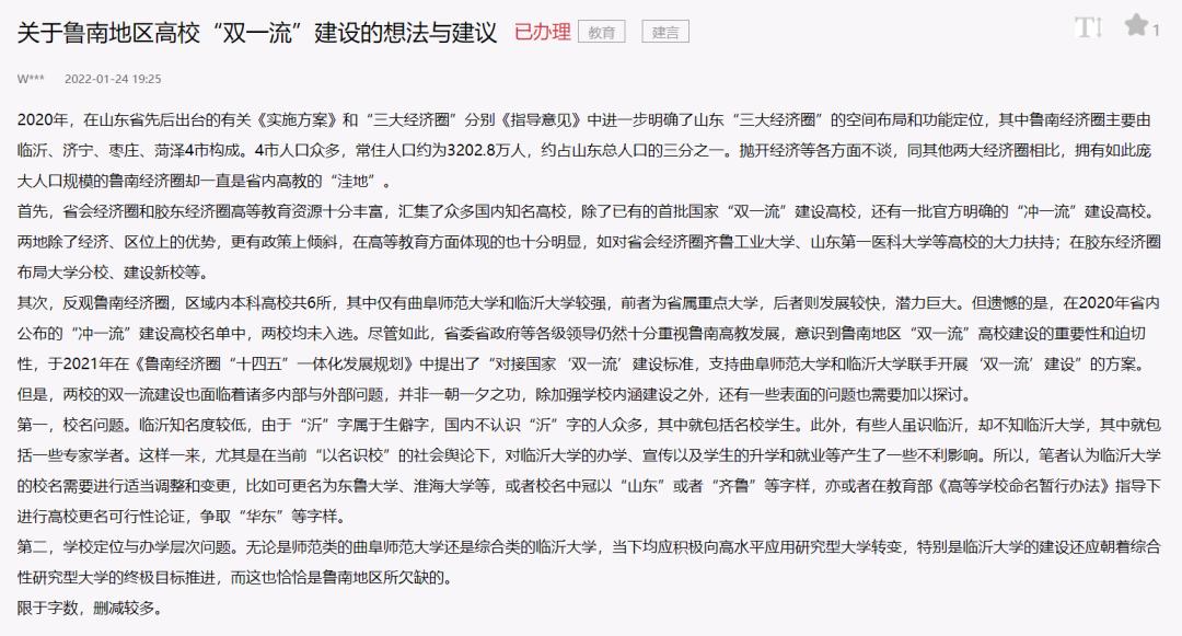 2022年1月24日,有网友在人民网领导留言板提出《关于鲁南地区高校“双一流”建设的想法与建议》。