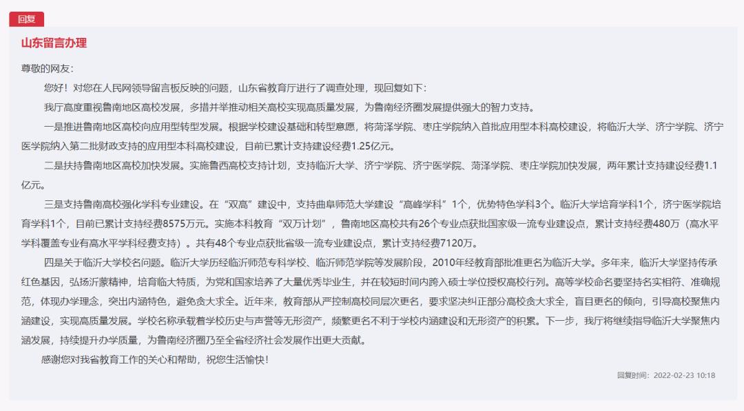 2022年2月23日,山东省教育厅经调查处理后回复称: