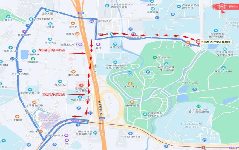 775路往华工大总站方向,停靠广东外贸学校站后,绕行龙洞东路再接回原线。临时取消停靠龙洞北站、龙眼洞森林公园站、迎新路口站、迎龙路站、龙洞路口站,临时增加停靠龙洞东路中站、龙洞东路站。