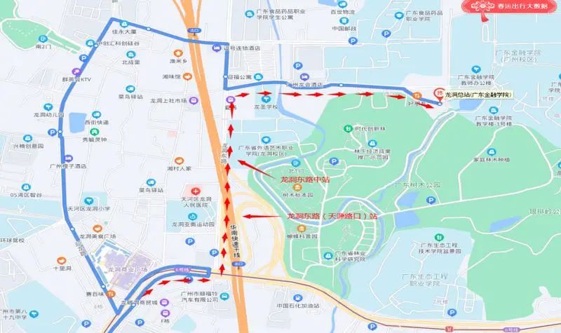 夜10路往龙洞(广东金融学院)总站方向,停靠地铁植物园(世纪绿洲)站后,绕行龙洞东路再接回原线行驶,临时取消停靠龙洞路口站、迎龙路站、迎新路口站、龙眼洞森林公园站,龙洞北站,临时增加停靠龙洞东路(天源路口)站、龙洞东路中站。
