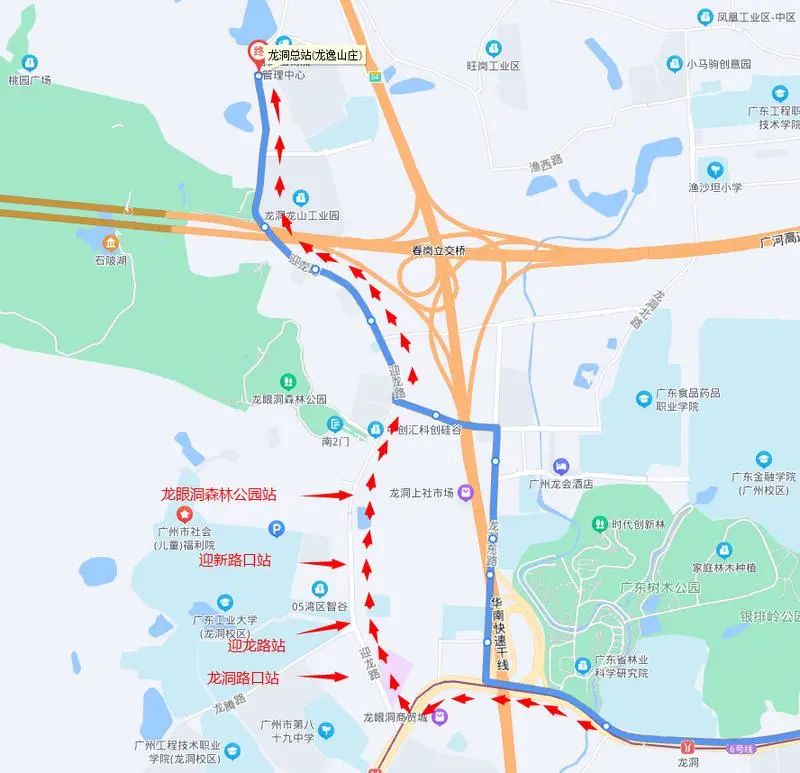 497A路往龙洞(龙逸山庄)总站方向,停靠地铁龙洞站后,绕行迎龙路再接回原线行驶。临时取消停靠龙洞东路(天源路口)站、龙洞东路站,龙洞东路中站,广东外贸学校站,龙洞北站,临时增加停靠龙洞路口站、迎龙路站、迎新路口站、龙眼洞森林公园站。