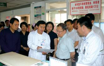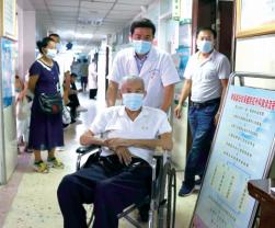 杨军(前排左二)向国家卫健委老龄健康司监察专员王谦(前排右二)介绍科室发展情况。