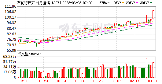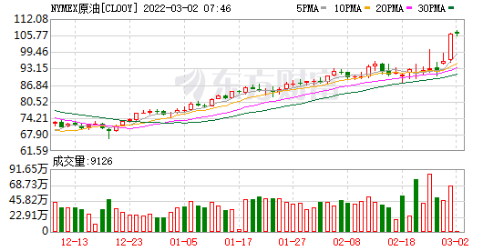 国际油价大幅上涨。纽约4月原油期货收涨7.69美元,涨幅8.03%,报103.41美元/桶;布伦特5月原油期货收涨7.00美元,涨幅7.14%,报104.97美元/桶。