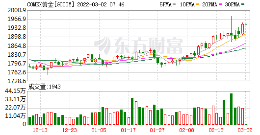 国际金价显著上涨,纽约商品交易所黄金期货市场交投最活跃的4月黄金期价上涨43.1美元,收于每盎司1943.8美元,涨幅为2.27%。