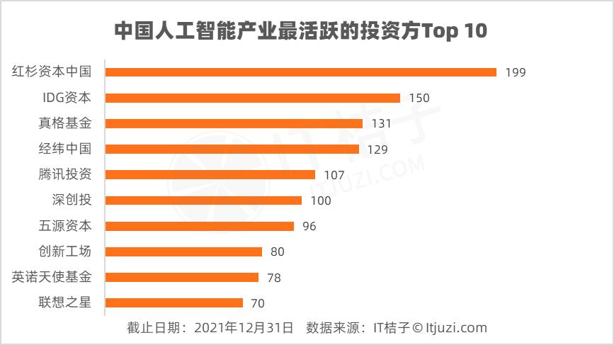 IT 桔子收录到的数据显示,中国人工智能产业最活跃的投资方前十名分别为红杉资本中国、IDG 资本、真格基金、五源资本、腾讯投资、英诺天使基金、创新工场、深创投和联想之星。这其中,截止到 2021 年底,红杉资本中国在AI 领域出手投资 199 次,位居榜首;IDG 资本以 150 起的投资事件位居第二;真格基金则凭借 131 次的投资数量名列第三位。