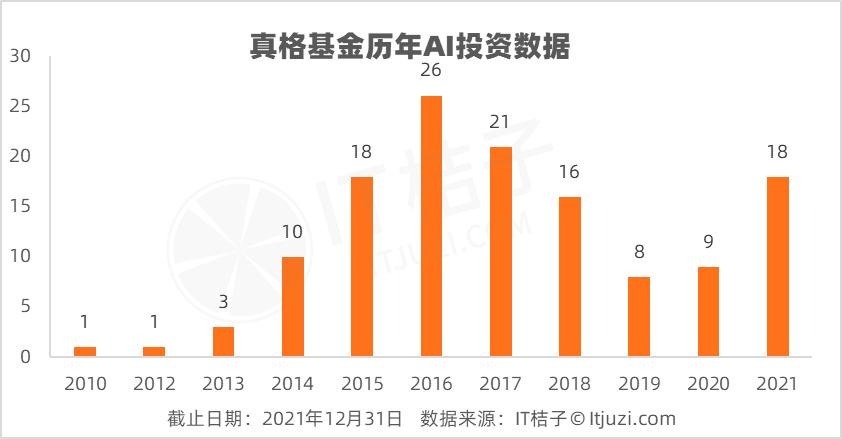 真格基金于 2010 年投出了人工智能领域第一笔投资,自此之后真格基金频频出手,于 2014-2018 年迎来投资高峰期,2016 年更是投出 26 起事件为历年之最,截止到 2021 年底总投资事件数为 131 起。