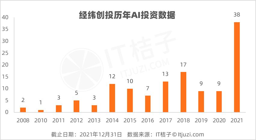 专注智能制造、硬科技等领域投资的经纬创投,自然会不会错过人工智能产业。成立于 2008 年的经纬创投,于 2010 年就开始了 AI 方面的投资。自 2011 年以来,经纬创投在人工智能领域的投资数量达到了 129 起,在国内所有投资机构中排名第四。IT 桔子注意到,相较于以往年份经纬投资数量较为均衡多在 20 起以内,但在 2021 年经纬创投出手投资了 38 次,同比翻了 4 倍多。