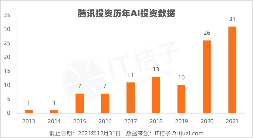 腾讯在人工智能方面的投资始于 2013 年对搜狗的战略投资,自此之后便开启了人工智能投资之路。腾讯在 AI 方面的投资,整体呈上升趋势,从 2013 年的 1 起投资事件,到 2017 年的 11 起投资事件,再到 2021 年的 31 起投资事件,腾讯不断加大对人工智能领域的投资,总投资事件达 107 起。