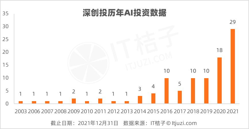 IT 桔子数据显示,早在 2003 年深创投就开始了在人工智能领域方面的投资,此后自 2006 至 2021 年,在长达 16 的时间内深创投每年都会对人工智能领域进行投资,现已出手投资数量达 100 起。