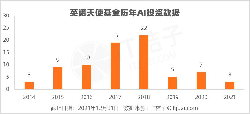 2013 年成立的英诺天使基金于 2014 年就开始了对人工智能领域的投资,到 2015 的时候英诺天使就明确了战略性投资人工智能项目的投资策略。2015-2016 年是英诺天使基金在 AI 领域的投资成长期,该时期共出手投资 19 次;2017-2018 年则是英诺天使基金投资高峰期,2 年内共有 41 起人工智能投资事件发生,平均一年投资 20 次;2019-2021 期间,伴随着资本寒冬的出现和突如其来的疫情影响,英诺天使基金 3 年内共出手投资 15 次,远不及之前 1 年的投资数量,投资热情明显回落。截止到 2021 年,英诺天使基金在 AI 领域共有 78 起投资事件发生。