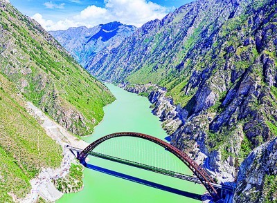 复兴号列车行驶在川藏铁路拉林段藏木特大桥。新华社发