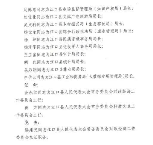 2022年2月22日,沿河土家族自治县第九届人民代表大会常务委员会第一次会议通过,决定任命: