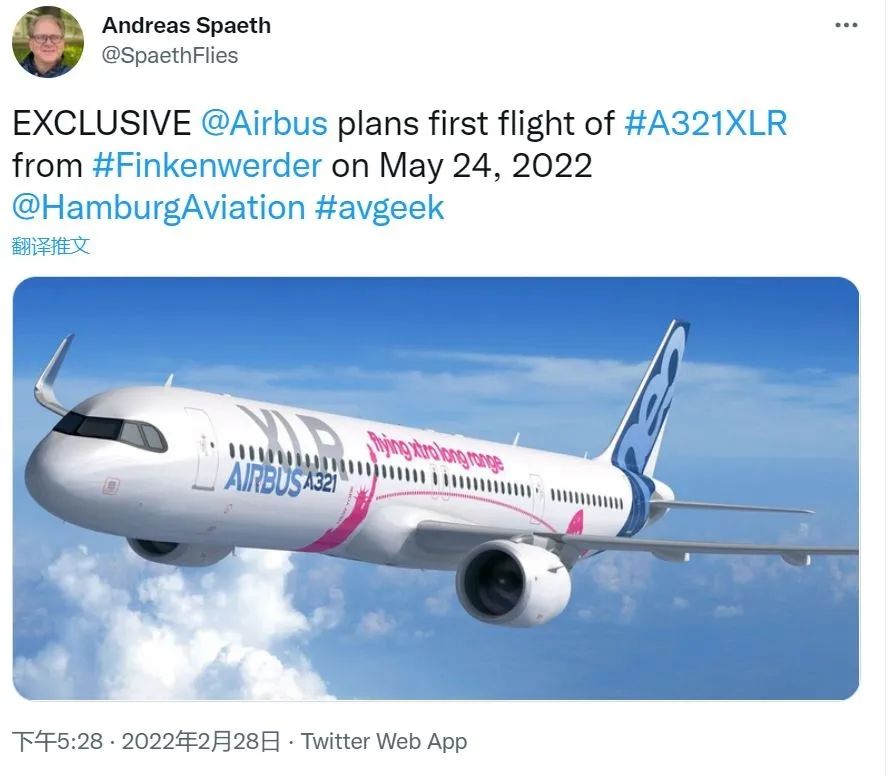 据德国航空记者Andreas Spaeth消息,空客计划在今年5月24日进行A321XLR首飞。