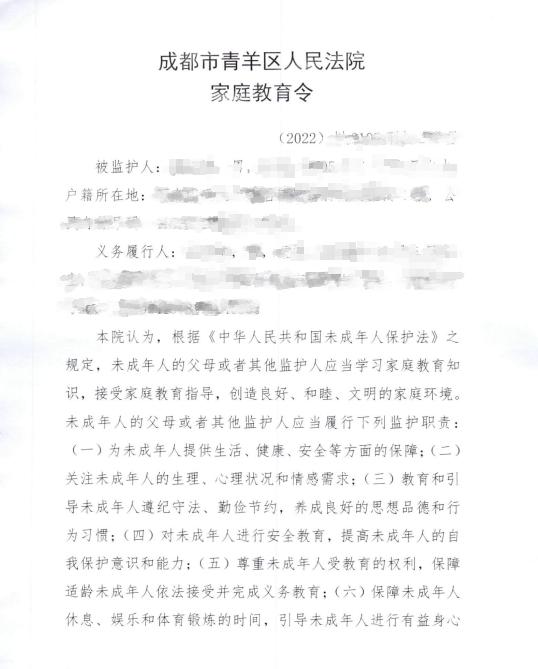 从前,家庭教育只是“家事”,如今成了“国事”。当未成年人出现了违法犯罪等严重不良行为时,或许也是父母出现了严重的家庭教育失职,这种情况下,政府和司法机关将进行干预!3月1日,成都市青羊区人民法院针对一起未成年犯罪行为发出首份《家庭教育令》。