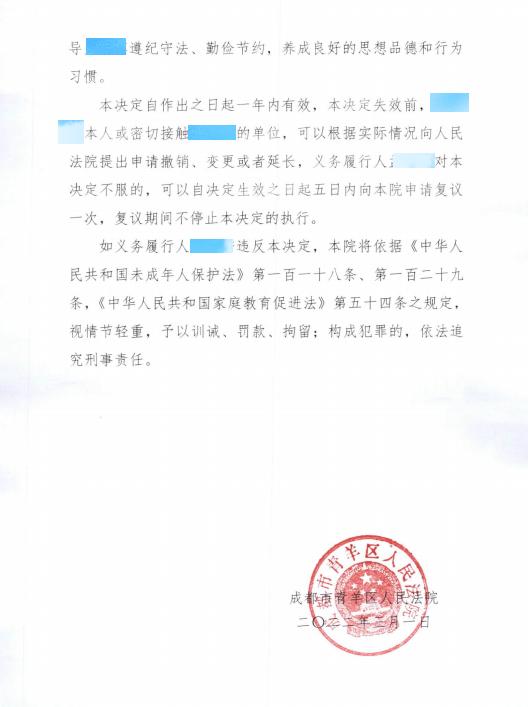 监护人收到《家庭教育令》后表示,已经深刻认识到自己在教育孩子上的失职行为,会积极履行家庭教育的主体责任,给孩子树立正确的价值观,帮助孩子改过自新。