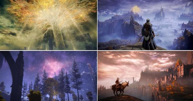艾尔登法环整体的画面风格非常华丽黑暗诡谲,给大家感受一下:这闪亮的黄金树,神秘的蓝色云海,迷人的紫调星空,暗藏杀机的城邦建筑