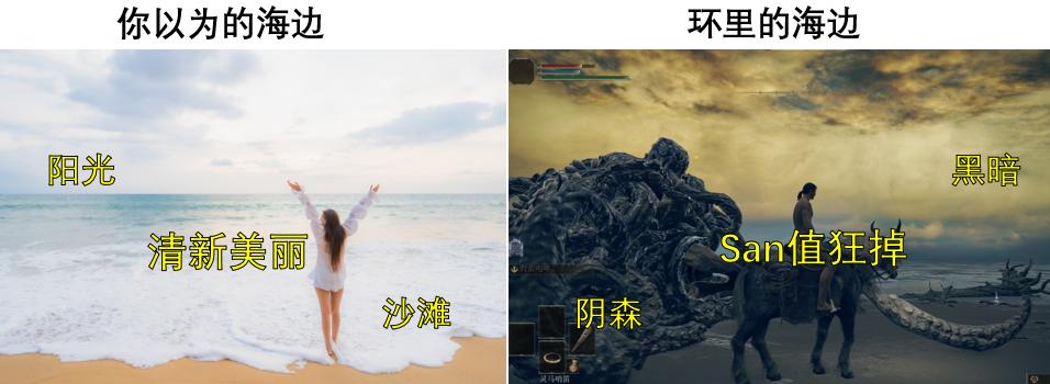 游戏里的地形也很丰富,经常会闯进山洞,陷入沼泽,跳下悬崖,误入海滩......不过,等一个自然而然的晴天,你可以带人去海边,在老头环里的海边你们可以看日落,这里掉落的不仅是sun,还有san。