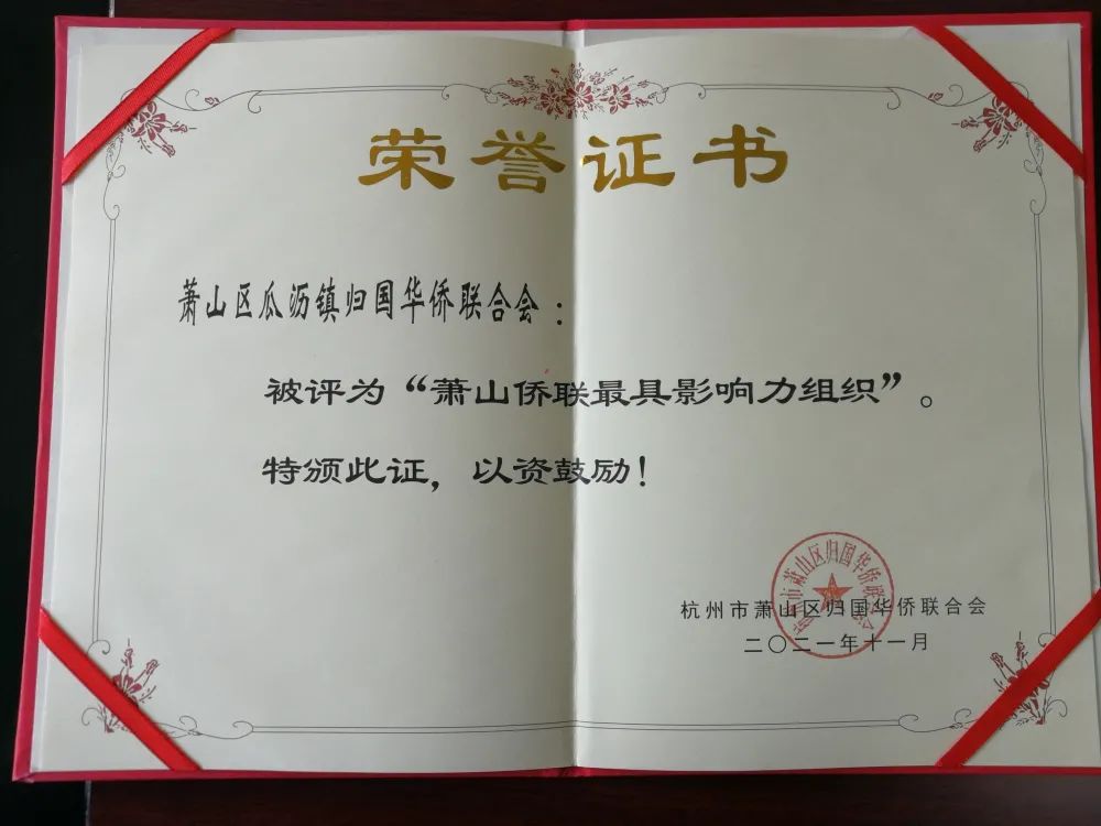 2021年瓜沥镇侨联被评为萧山侨联最具影响力组织。