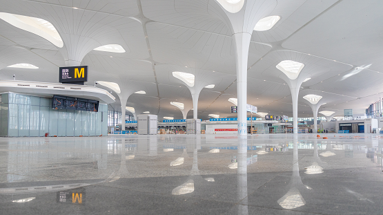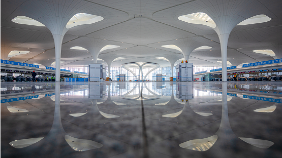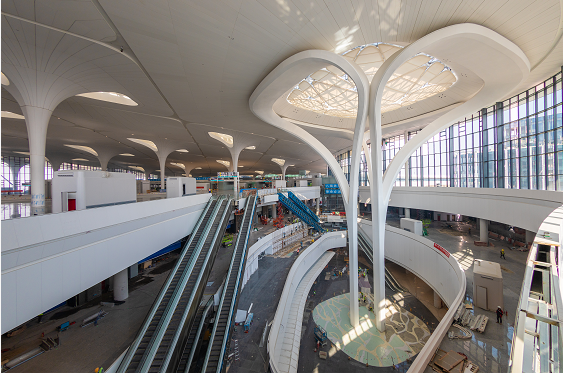 其中,航站楼地下二层、地上四层(局部五层),平面布局采取了集中式构型设计,空间导向明确,分为一个主楼、南北两条水平长廊和北面三根指廊。