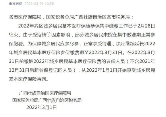 记者从市医保局获悉,近日,自治区医疗保障局、国家税务总局广西壮族自治区税务局联合发出通知,2022年城乡居民基本医疗保险参保缴费期延长至2022年3月31日,请未办理缴费的参保人员尽快办理。