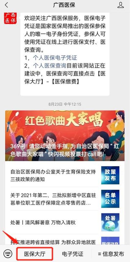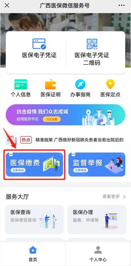 进入“医保大厅”首页,点击“医保缴费”开始按步骤参保缴费。
