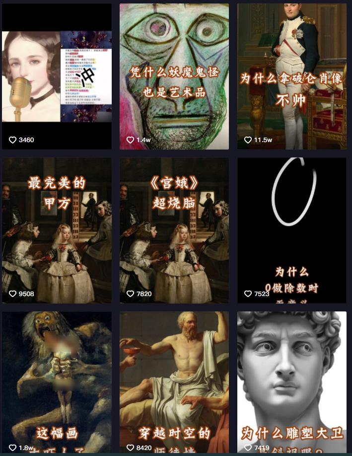 事实证明她是正确的,古灵精怪的少女今天探究雕塑《大卫》为什么是斜视眼,明天研究为什么拿破仑肖像不帅。萝莉脸、钻石夹子音、清奇的解说角度,使得账号在短时间内就积累了上万的粉丝量。